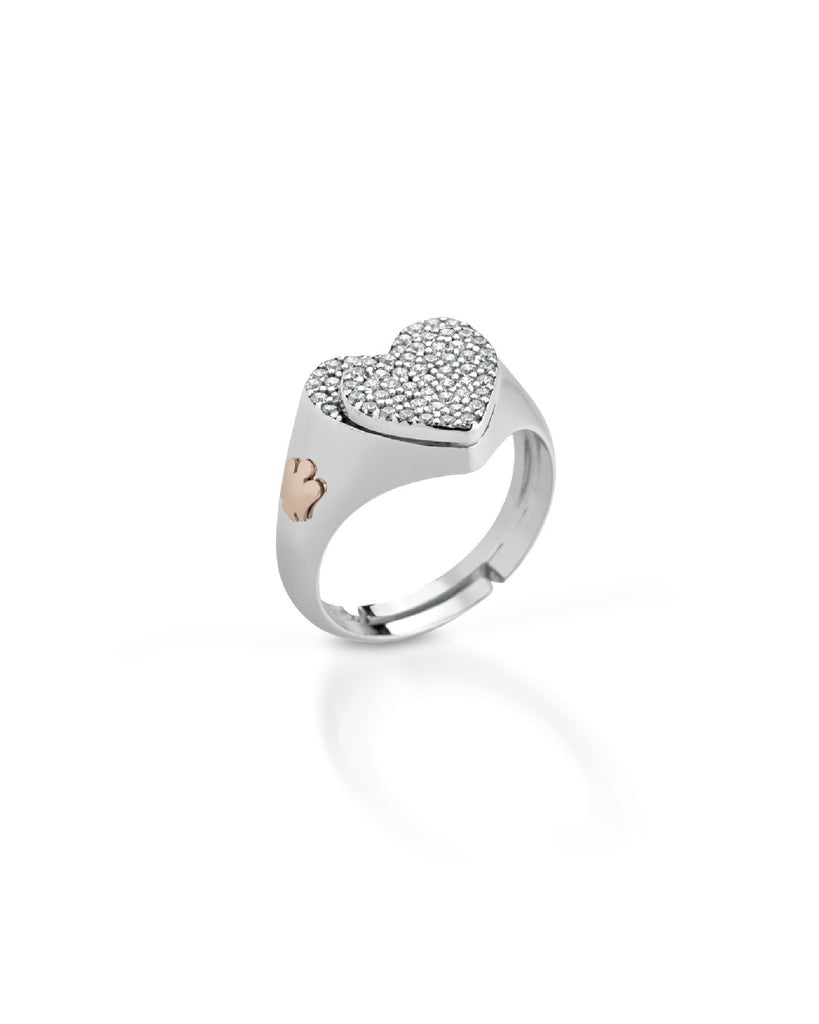 Anello chevalier della collezione Roberto Giannotti Microlighting da donna. Colore: argento e oro rosa. L'anello è in argento 925‰ rodiato e rosé con un doppio cuore impreziosito da un pavé di zirconi e da un angioletto posizionato a lato. Dimensione del cuore: base 1,2 cm e altezza 1,2 cm.