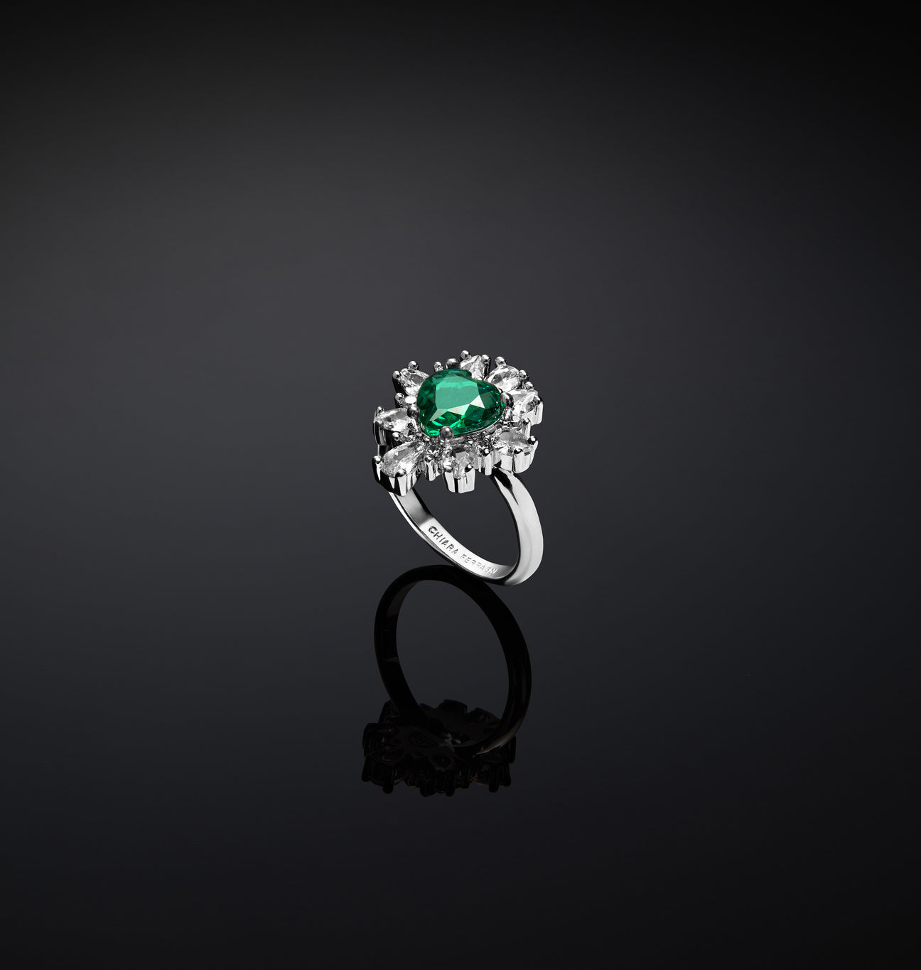 Anello placcato argento con cuore verde smeraldo impreziosito da un pavé di zirconi bianchi.