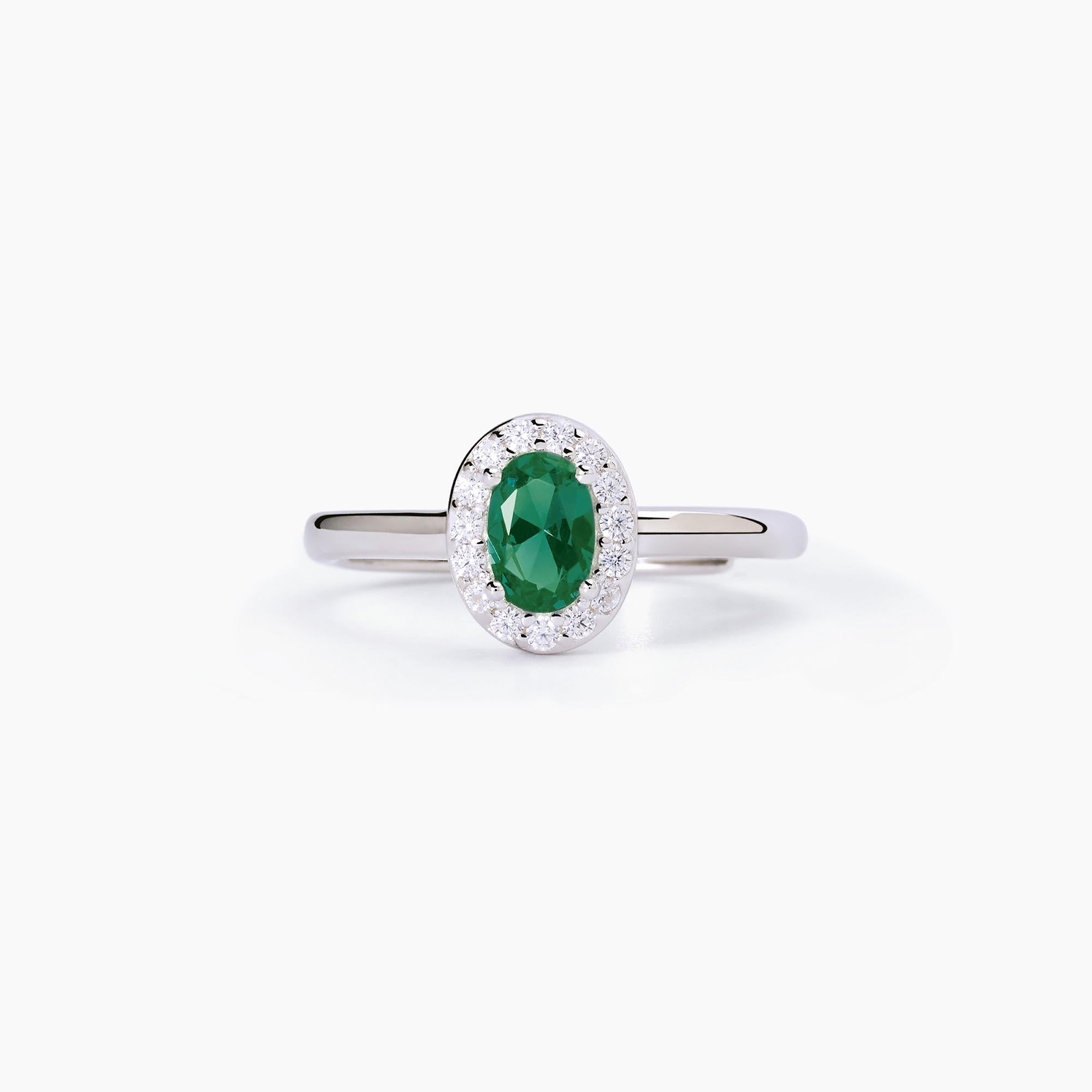 Anello da donna in argento rodiato con smeraldo sintetico ovale e zirconi bianchi.
