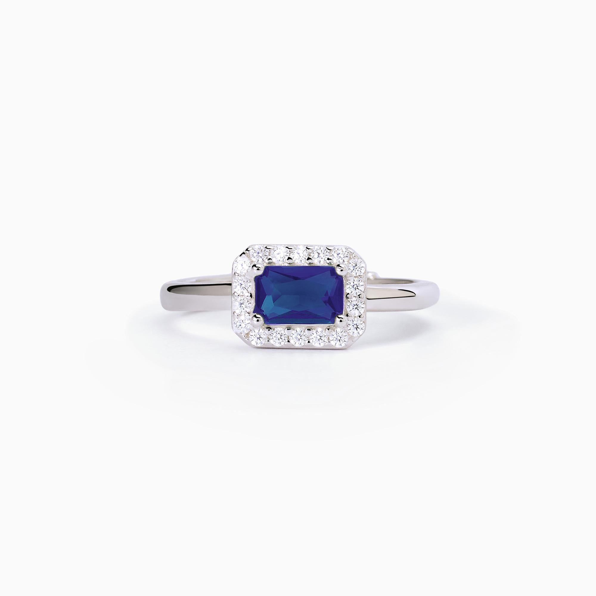 Anello da donna in argento rodiato con zaffiro sintetico taglio baguette e zirconi bianchi.