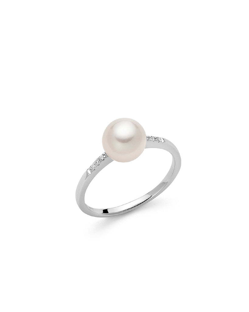 Anello della collezione Miluna Anelli Con Perle da donna. Colore: oro bianco e bianco. L'anello è in oro bianco 750‰ (18kt) con perla coltivata centrale di colore bianco ø 7,5-8 e sei diamanti naturali di taglio brillante rotondo con caratura totale 0,26 - colore G - purezza SI.