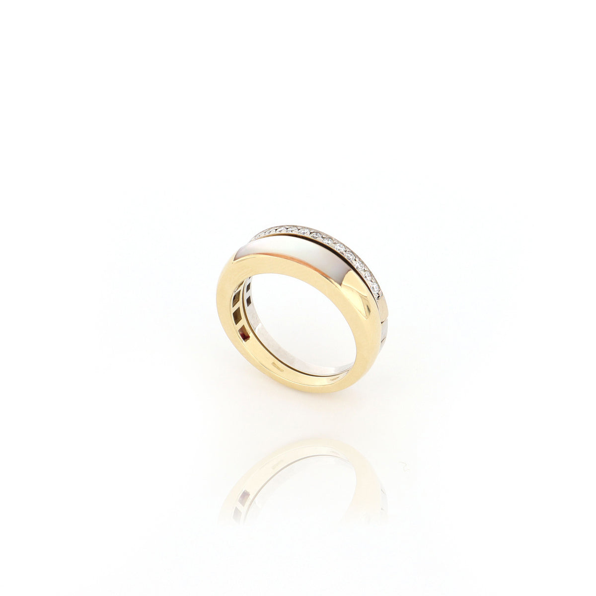 Oro giallo e bianco per questo anello dove la lattiginosità della madreperla trova la sua controparte nel bianco luminoso dei diamanti. All'interno, romantici segreti. Un design elegante e sorprendente.