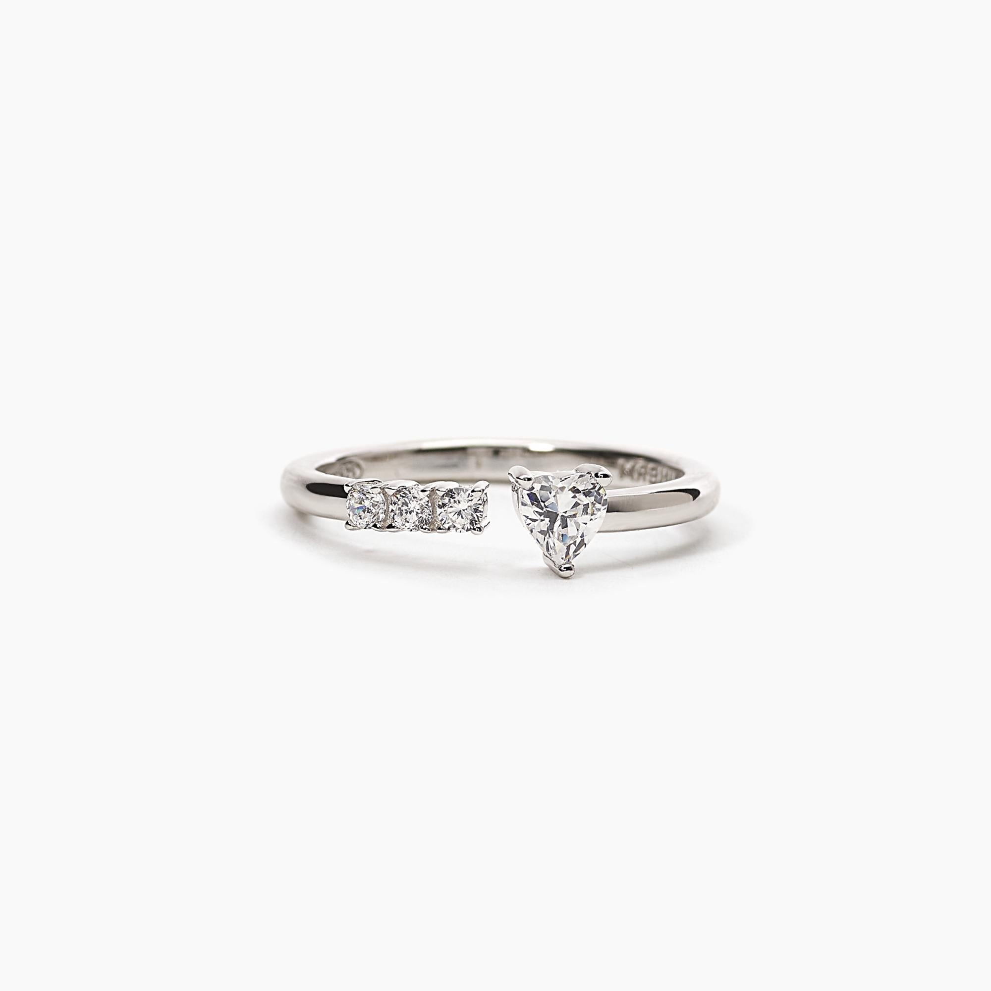 Anello aperto in argento con zircone taglio cuore e tre punti luce.