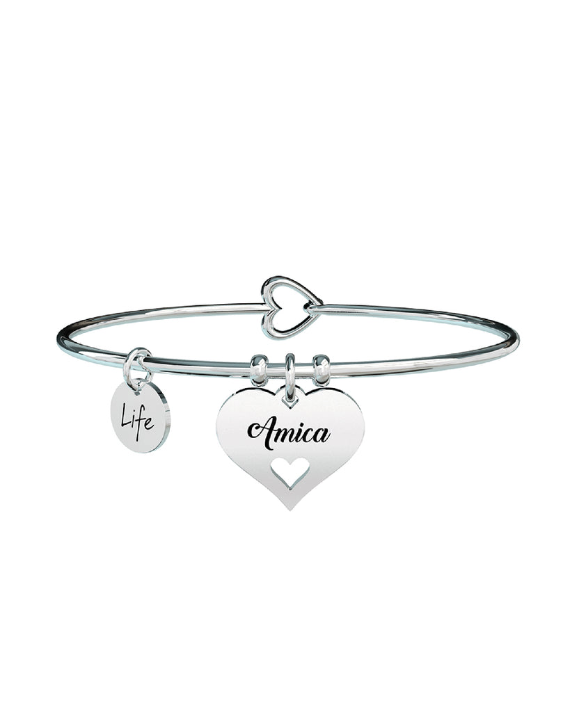 Bracciale rigido della collezione Kidult Love da donna. Colore: argento. Bangle in acciaio inossidabile 316L con ciondolo a forma di cuore e incisione smaltata "Amica". Misura unica: diametro 6 cm, con chiusura cuore. Designed by Kidult in Italy.