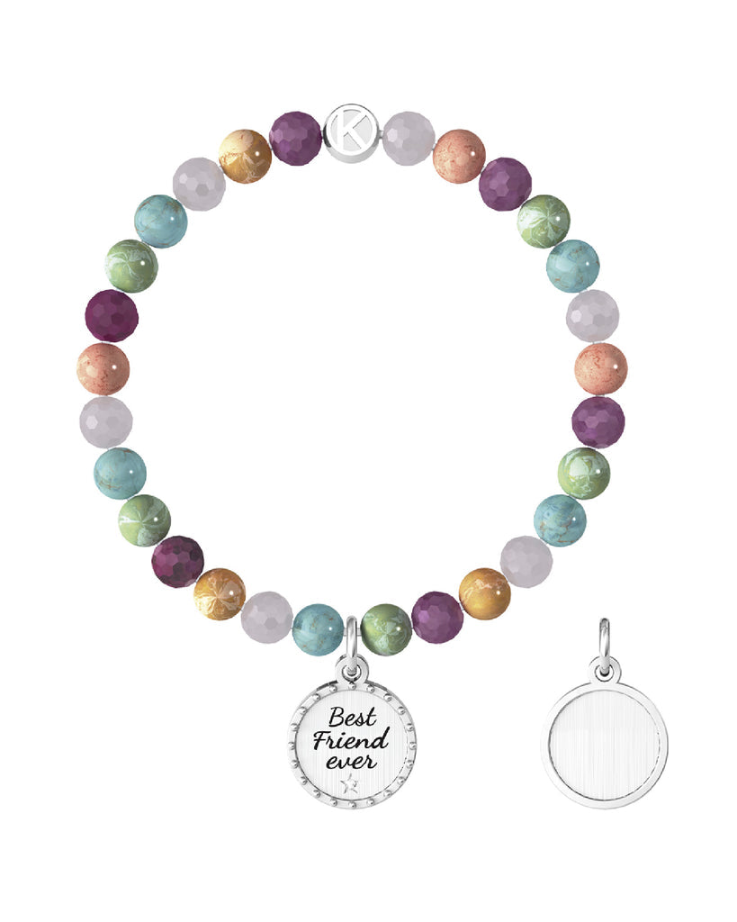 Bracciale elastico della collezione Kidult Love da donna. Colore: multicolor e argento. Il gioiello è in acciaio inossidabile 316L caratterizzato da pietre naturali di diversi colori con un ciondolo tondo centrale con incisione smaltata "Best friend ever" e un cristallo. Dimensione del ciondolo: 15 mm x 15 mm. Designed in Italy by Kidult.