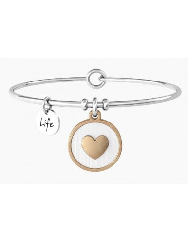 Bracciale rigido della collezione Kidult Family da donna. Colore: argento e oro rosa. Bangle in acciaio inossidabile 316L con trattamento pvd oro rosa sul ciondolo tondo satinato. Presenta sul davanti un'incisione smaltata "Per il mondo sei mia MAMMA. Per me, tu sei il mondo" e sul retro un cuore color oro rosa. Dimensione del ciondolo: 18 mm. Misura unica con chiusura a cerchio. Designed in Italy by Kidult.