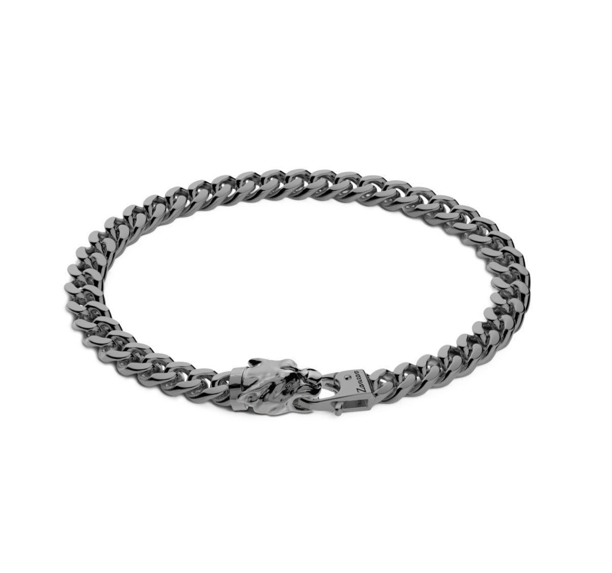 Bracciale grumetta Zancan in argento 925. Il bracciale a maglia morbida, con colorazione nera lucida, è caratterizzato nella chiusura dalla testa di una pantera che azzanna il moschettone. La particolare colorazione è ottenuta da una lavorazione al rutenio che ne rende l'aspetto inalterabile. Un gioiello dal forte impatto, dallo stile contemporaneo. Il bracciale fa parte della collezione Cubane, ispirata al mondo Hip-hop ed underground. Il bracciale è interamente realizzato a mano in Italia ed ha un peso di 26.20gr