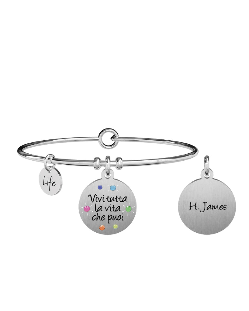 Bracciale rigido della collezione Kidult Philosophy da donna. Colore: argento. Bangle in acciaio inossidabile 316L con ciondolo tondo satinato impreziosito da cristalli colorati e da incisione smaltata nera "Vivi tutta la vita che puoi - Henry James -". Misura unica con chiusura tonda. Designed by Kidult in Italy.