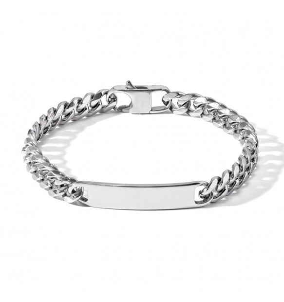 Braccialetto da uomo realizzato con maglia groumetta in acciaio anallergico. Targa centrale personalizzabile.