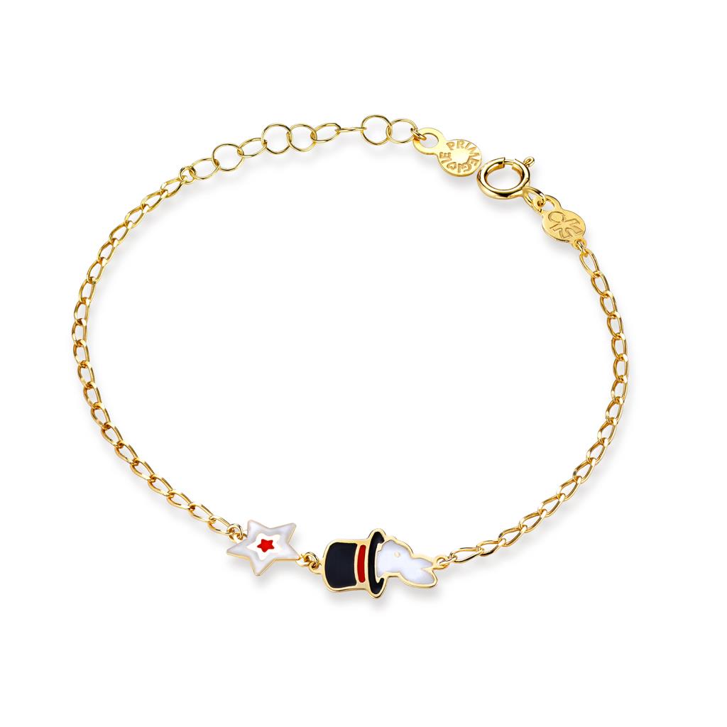 Bracciale LeBebè della collezione Primegioie con catena e ciondoli coniglio e stellina realizzati in oro giallo 9kt smaltato. Chiusura regolabile a molla.