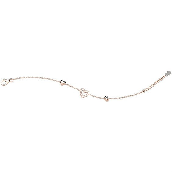 bracciale bambina in argento 925 placcato oro rosa con cuore centrale in zirconi bianchi e due cuoricini laterali lucidi.