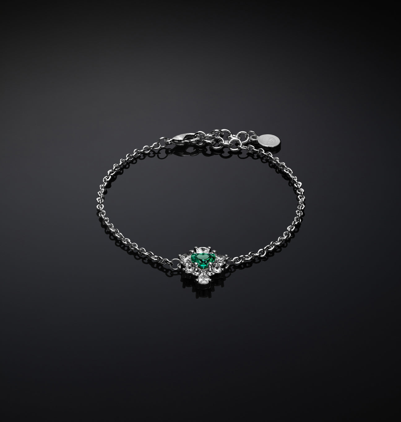 Bracciale placcato argento con cuore verde smeraldo impreziosito da un pavé di zirconi bianchi.