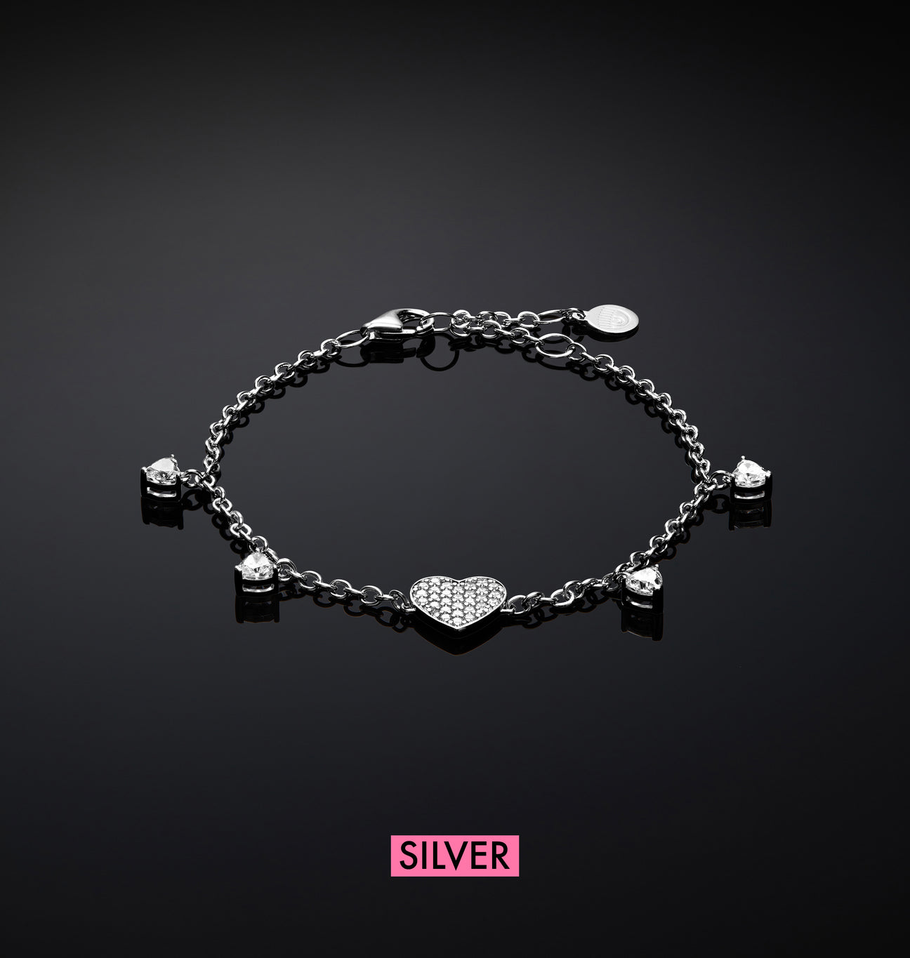 Bracciale realizzato in argento 925 con zirconi bianchi a forma di cuore e charm centrale con pavé.