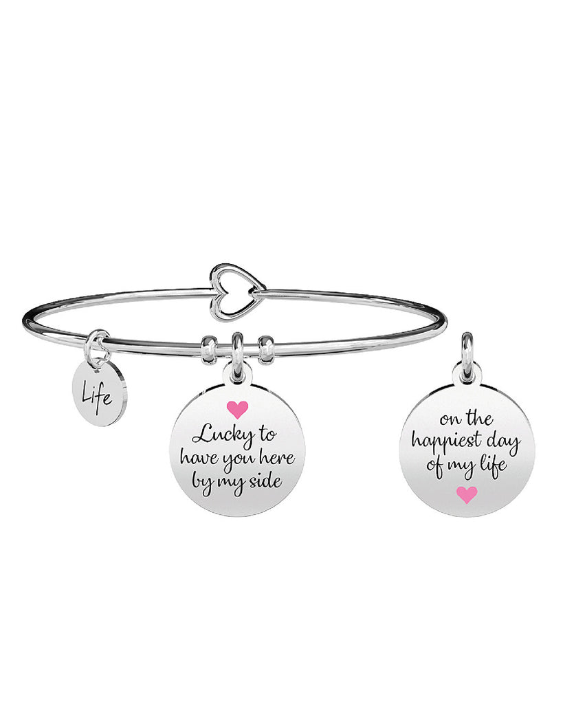 Bracciale rigido della colelzione Kidult Special Moments da donna. Colore: argento e rosa. Bangle in acciaio inossidabile 316L con ciondolo tondo e scritta smaltata con cuoricino "Lucky to have you here by my side" sul davanti e "On the happiest day of my life" sul retro. Misura unica con chiusura a cuore.