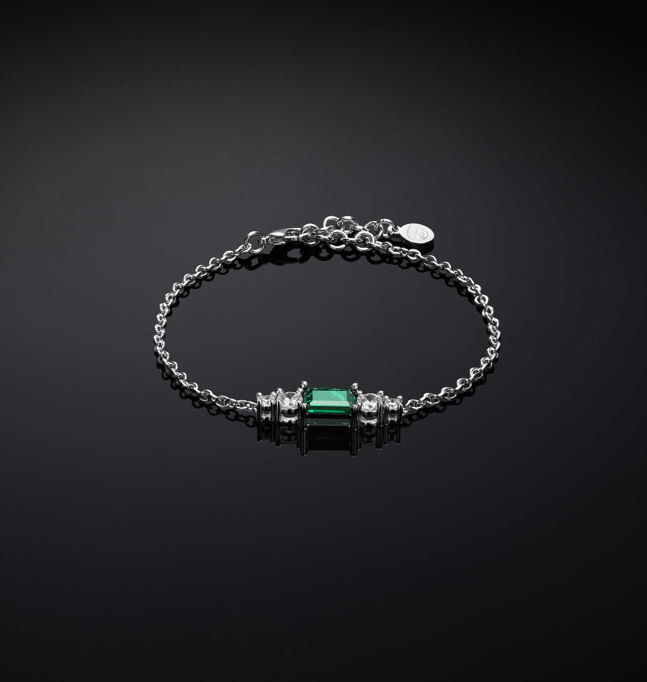 Bracciale placcato argento con zirconi bianchi rotondi ed uno zircone verde taglio smeraldo.