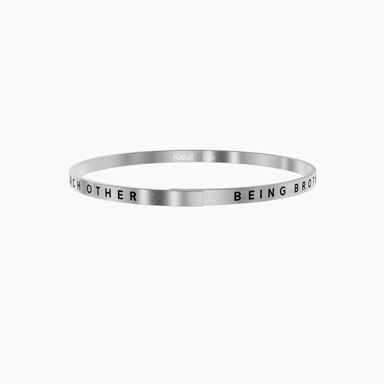 Bracciale rigido della collezione Kidult Family da donna. Colore: argento e nero. Bangle sottile in acciaio satinato inossidabile 316L con incisione smaltata nera "Being brother and sister means being there for each other" (traduzione: Essere fratello e sorella significa esserci l'uno per l'altra). Misura unica: diametro 6 cm, con chiusura a scomparsa. Designed by Kidult in Italy.