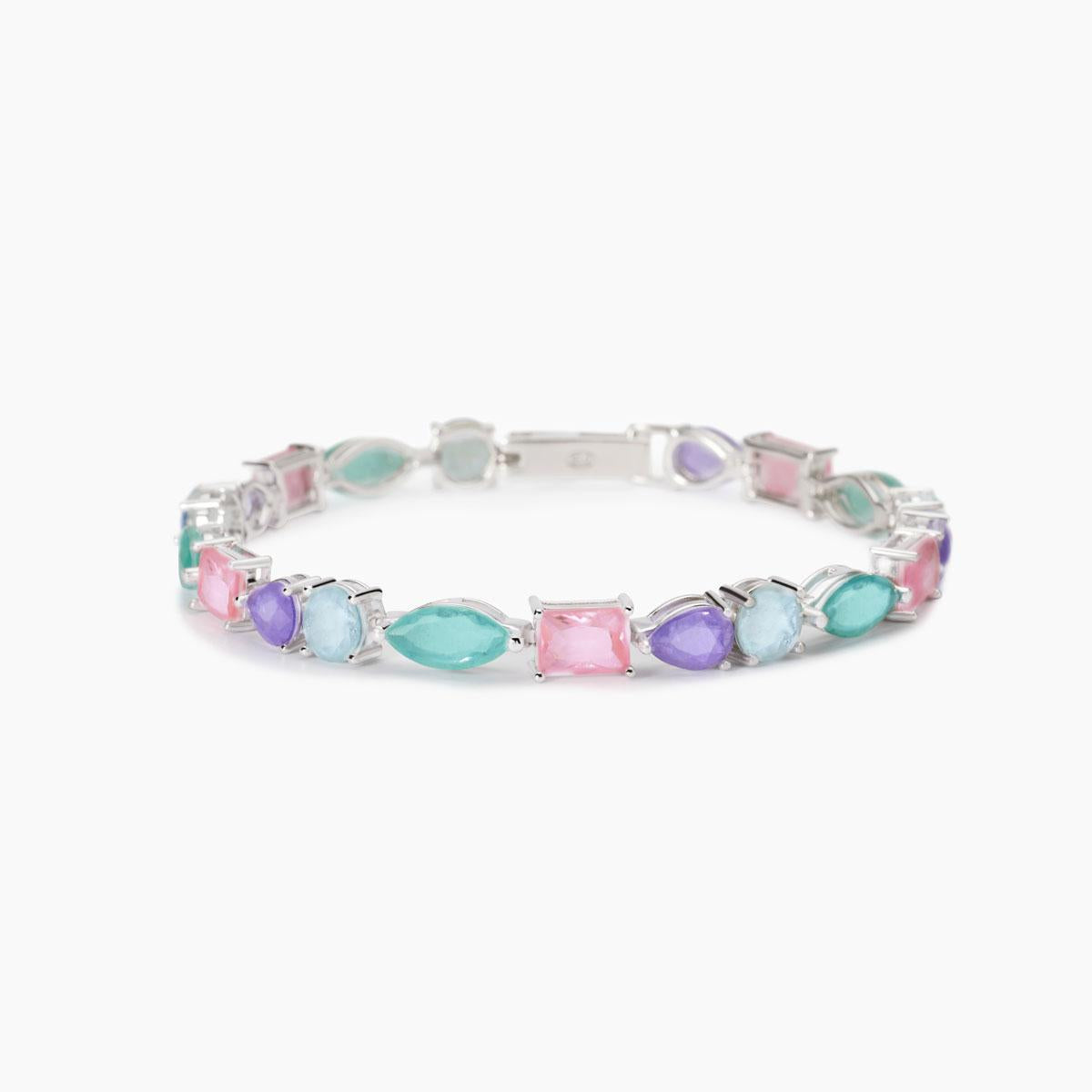 Bracciale da donna in argento rodiato con elementi fusion stone multicolor. Elementi in glass e cristallo di rocca in differenti tagli.