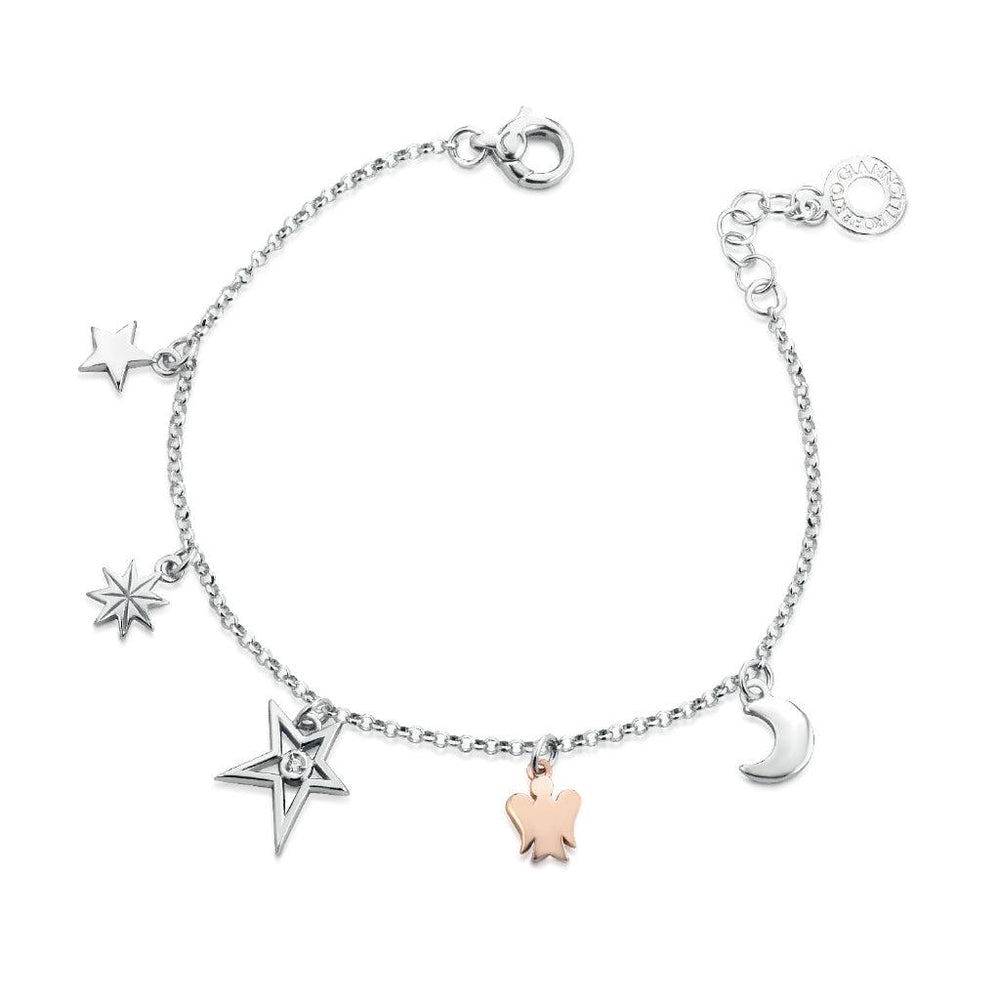 Bracciale catena della collezione Roberto Giannotti Angeli Argento da donna. Colore: argento e rosè. Il gioiello è in argento 925‰ formato da catena e charms a forma di angelo rosato, luna e stella con diamante di caratura 0,01. Misura 17 - 19 cm con chiusura a moschettone.