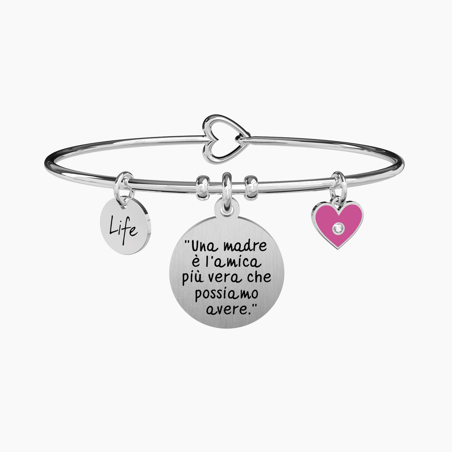 Bracciale rigido della collezione Kidult Family da donna. Colore: argento e rosa. Bangle in acciaio inossidabile 316L con due ciondoli, di cui uno tondo con incisione smaltata "Una madre è l’amica più vera che possiamo avere" e sul retro "W. lrving" e l'altro più piccolo a cuore smaltato rosa e con cristallo centrale. Misura unica con chiusura a cuore. Designed by Kidult in Italy.