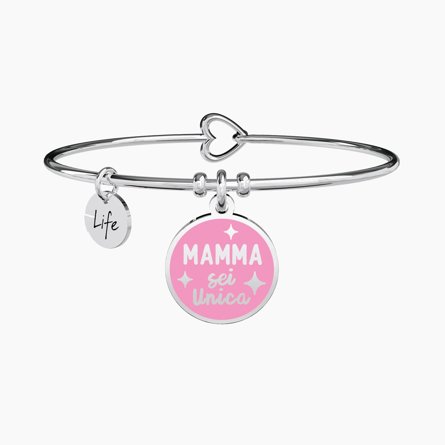 Bracciale rigido della collezione Kidult Family da donna. Colore: argento e rosa. Bangle in acciaio inossidabile 316L con ciondolo tondo e incisione smaltata "MAMMA sei unica". Il gioiello presenta lo smalto rosa sul ciondolo. Misura unica: diametro 6 cm, con chiusura cuore. Designed by Kidult in Italy.