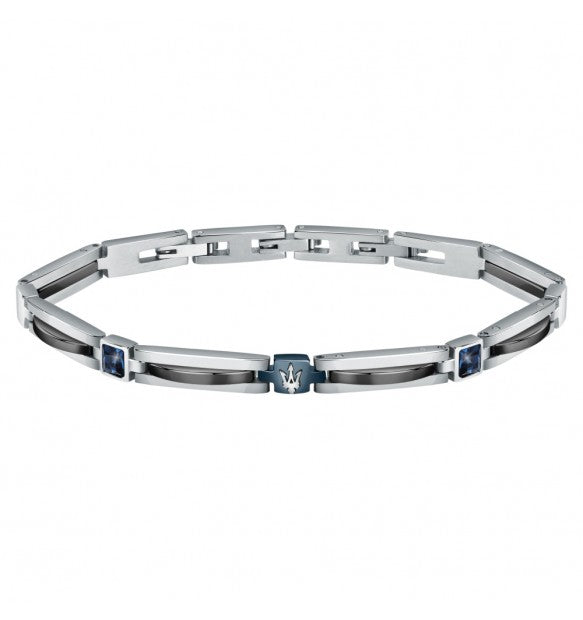 Braccialetto da uomo realizzato in acciaio anallergico con finitura lucida, elementi con trattamento ip blu e dettagli in ceramica nera.