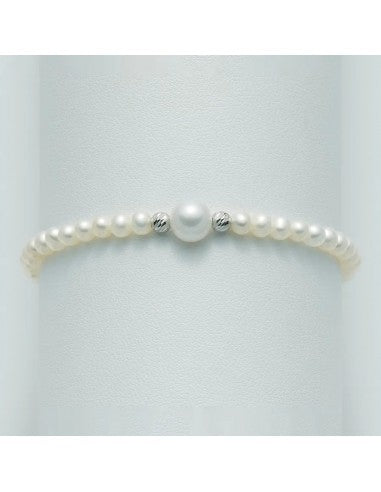 Bracciale Miluna perle coltivate di acqua dolce 4-4,5 mm con perla centrale 7,5-8 mm e 2 sfere diamantate in oro bianco 9 kt e gancio in oro bianco