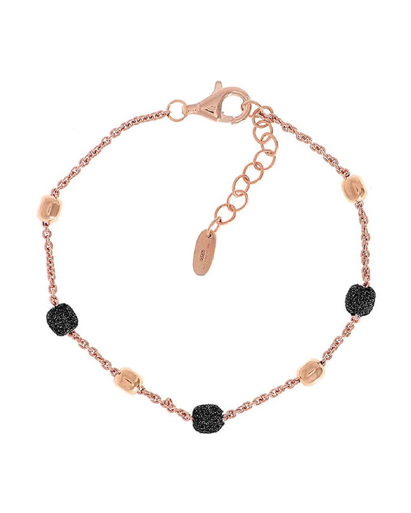 Bracciale catena della collezione Pesavento Polvere Di Sogni da donna. Colore: oro rosa e nero. Il gioiello è in argento 925‰ rosé caratterizzato da 7 elementi quadrati passanti, tre dei quali sono impreziositi da micro-particelle ottenute, con la nanotecnologia, dalla lavorazione di materiali naturali minerali, a seconda delle caratteristiche e dei colori che si desiderano ottenere, e hanno una forma esagonale per esaltare l'effetto ottico della riflessione. Chiusura a moschettone.