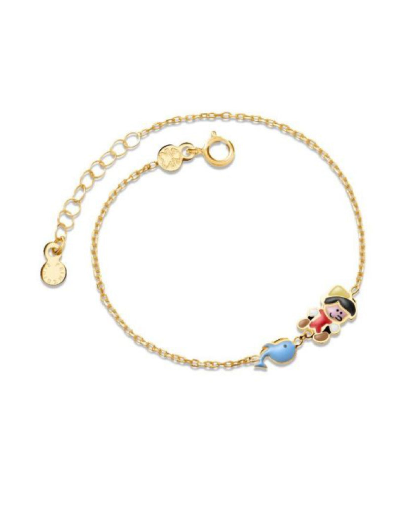 Bracciale a catena della collezione leBebé Primegioie da bambino. Colore: oro giallo e multicolor. Il gioiello è in oro giallo 375‰ (9kt) composto da catena con Pinocchio e Balena smaltati. Chiusura regolabile a moschettone.