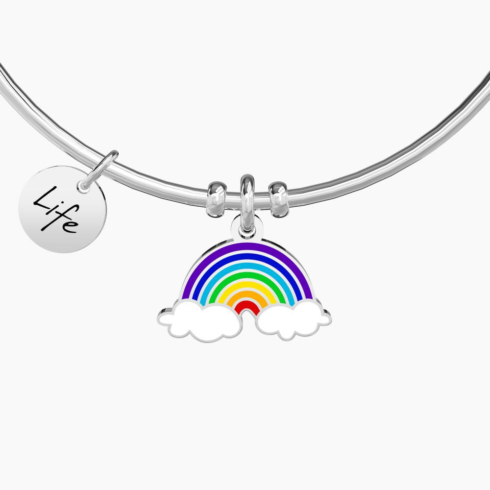 Bracciale Da Donna Di Kidult Della Collezione Symbols. Bangle In Acciaio Color Argento Con Ciondolo Arcobaleno. Smalti Colorati Sul Ciondolo. Chiusura Tonda. Misura Unica: Diametro 6 Cm. Materiale: Acciaio 316L, Smalto E Cristallo. Designed By Kidult In Italy. La Scritta Presente Nel Bracciale È " Sorridi Alle Avversità, Guarda Il Sole Dietro Le Nuvole. E' Proprio In Un Giorno Di Pioggia Che Spunterà L'Arcobaleno.". La Referenza È 731624