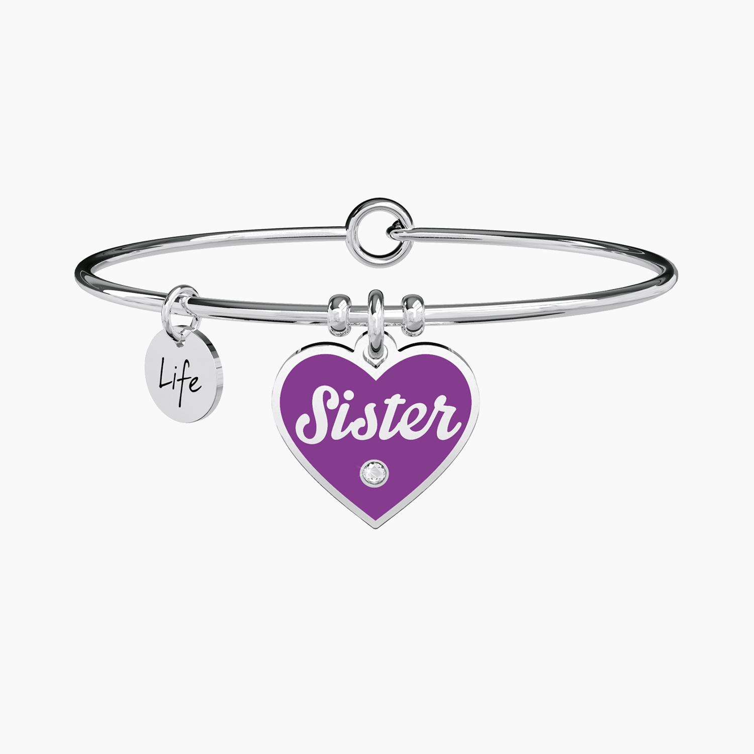 Bracciale rigido della collezione Kidult Family da donna. Colore: argento e viola. Bangle in acciaio inossidabile 316L con ciondolo a forma di cuore. Il gioiello presenta un cristallo, lo smalto viola e l'incisione smaltata "Sister" sul ciondolo. Misura unica: diametro 6 cm, con chiusura tonda. Designed by Kidult in Italy.