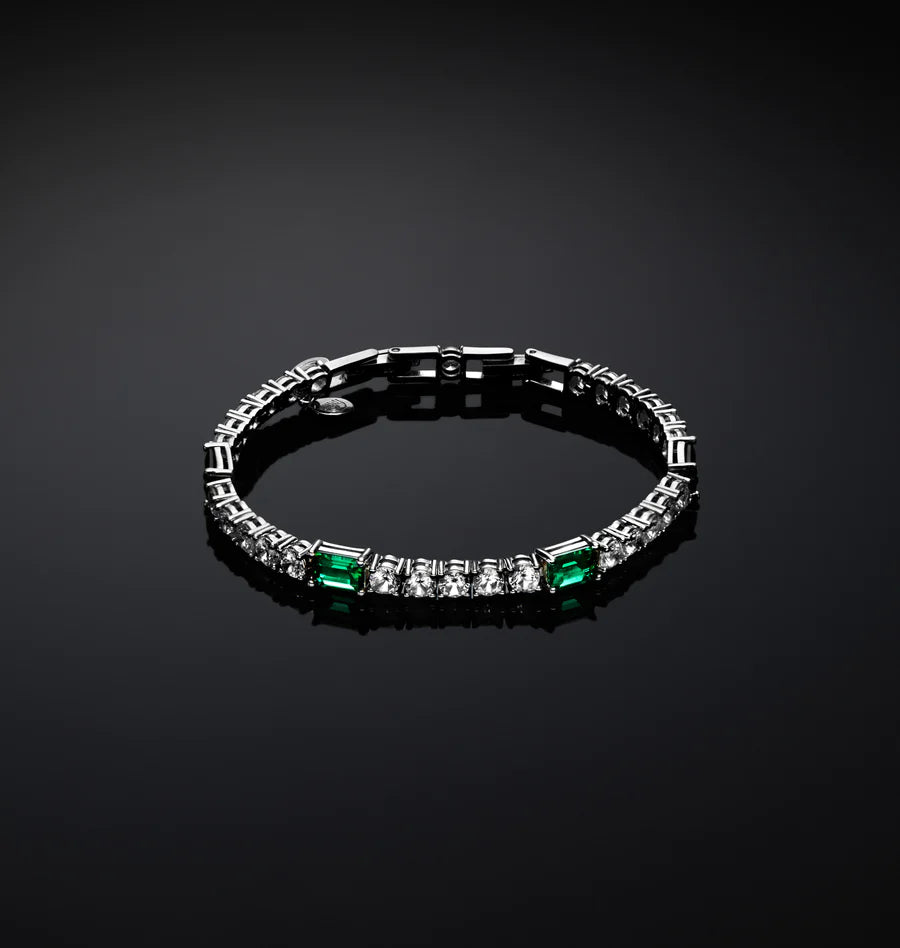 Il bracciale, modello Tennis, è caratterizzato da zirconi verdi alternati ogni cinque da luminosi zirconi bianchi taglio tondo.