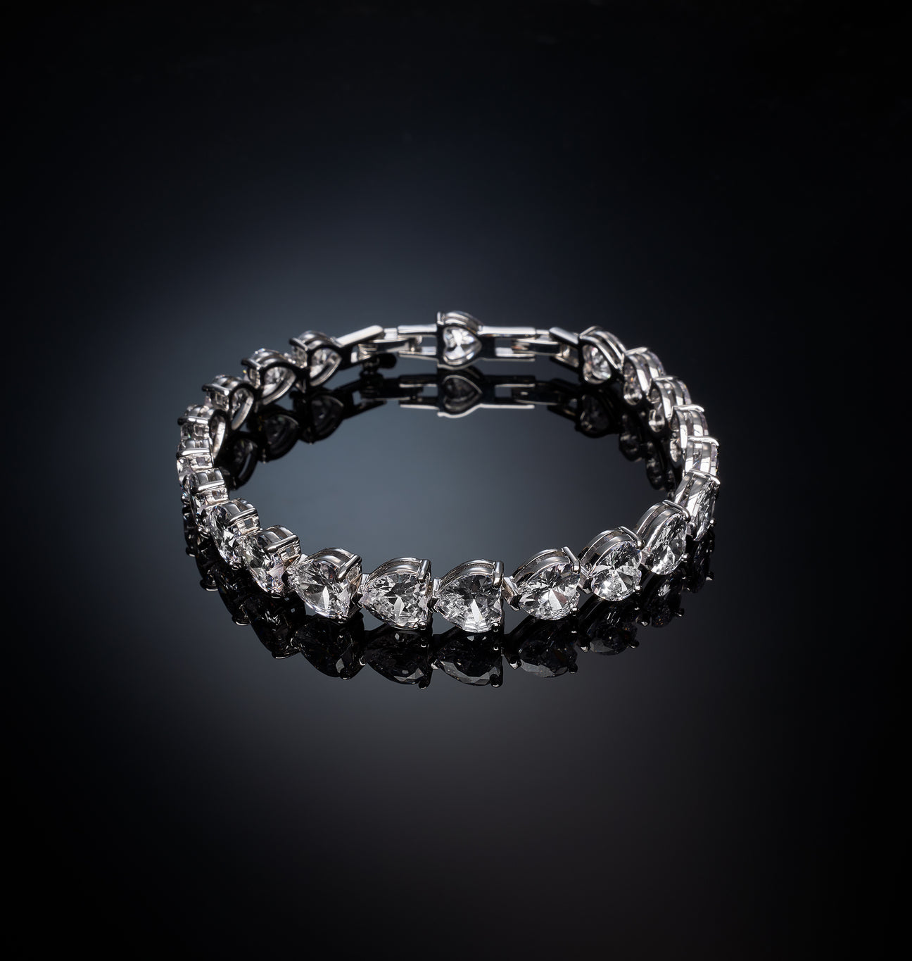 Bracciale tennis in Rodio con zirconi bianchi a forma di cuore orizzontali. Dim. 175 mm