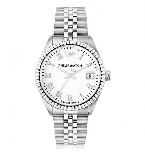 Orologio da uomo con movimento al quarzo e funzioni di solo tempo con data. Cassa rotonda in acciaio inox dal diametro di 41 mm. Lunetta zigrinata. Fondello e corona a vite. Quadrante bianco con indici a numeri romani, logo a ore 12 e datario a ore 3 con lente di ingrandimento. Vetro zaffiro. Cinturino in acciaio