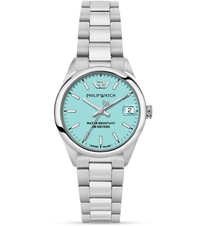 Orologio donna Philip Watch Caribe Urban. Movimento al quarzo Swiss Made, solo tempo e data. Cassa da 31 mm in acciaio con finitura lucido satinato. Vetro zaffiro antiriflesso. Quadrante tiffany con indici e lancette luminescenti. Datario a ore 3 con lente di ingrandimento. Cinturino in acciaio con chiusura deployante.