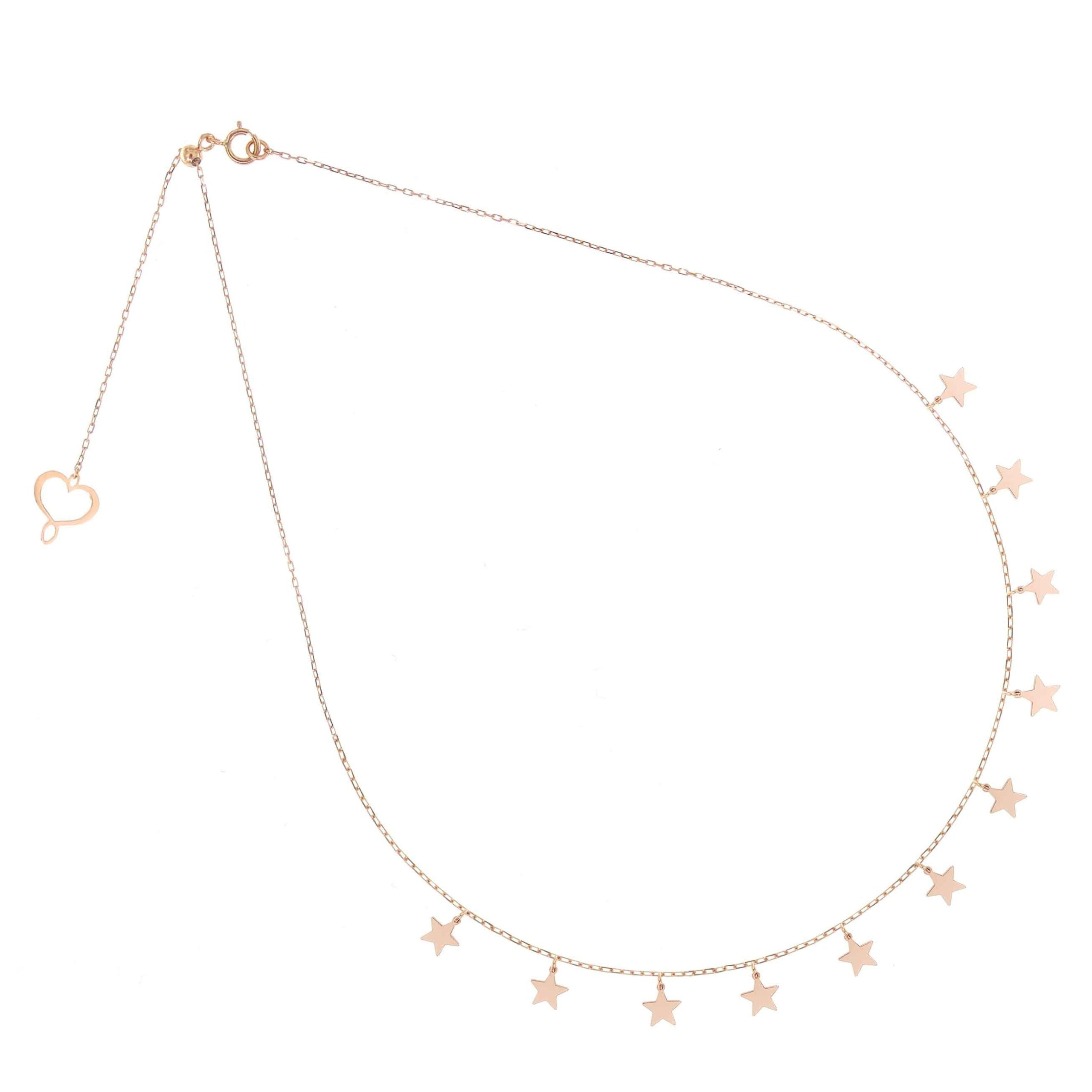 Girocollo Aurum realizzato in oro rosa 18 carati con undici stelle pendenti di 6 mm x 6 mm. La circonferenza del girocollo è regolabile grazie alla sfera scorrevole fino ad un massimo di 41 cm. Chiusura con anello a molla.