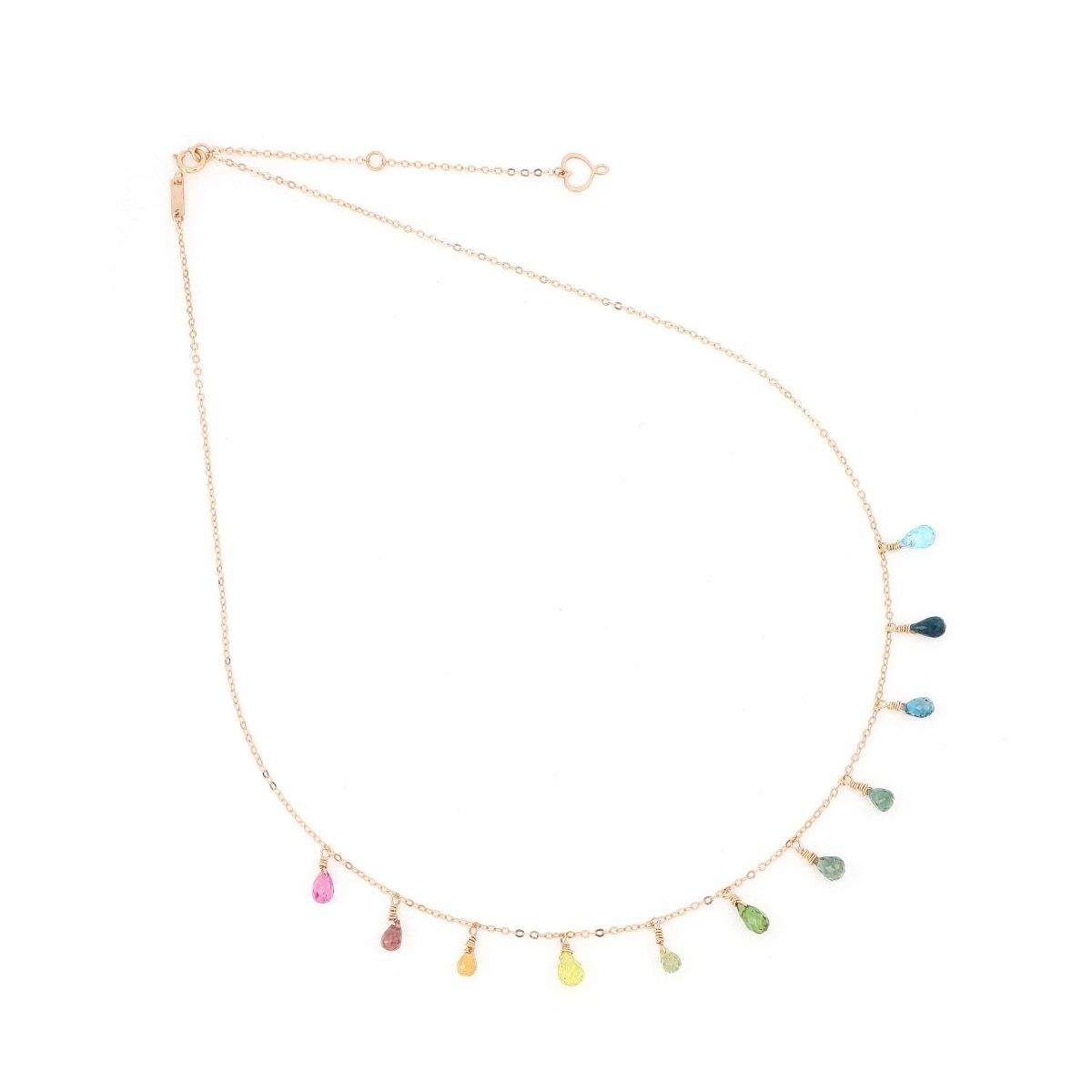 Girocollo Drops in oro rosa 18 carati con undici gocce di Topazi e Tormaline di diversi colori pendenti. Le tonalità delle pietre vanno da rosa, arancione, verde, azzurro fino al blu. Il girocollo può essere regolato in tre lunghezze: 36 cm, 38,5 cm e 41 cm e presenta un cuore Maman traforato. Chiusura con anello a molla.
