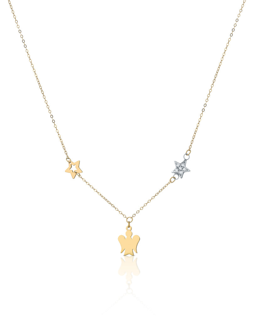 Collana pendente della collezione Roberto Giannotti Angeli Oro Young da donna. Colore: oro e argento. Il gioiello è in oro 375‰ (9kt) caratterizzato da un angelo e da due stelle, una oro giallo e una oro bianco tempestata da zirconi bianchi. Angelo: Base 0,8 cm - altezza 1 cm, Stella: Base 0,65 cm - altezza 0,65 cm. Misura 40 - 45 cm con chiusura a moschettone.