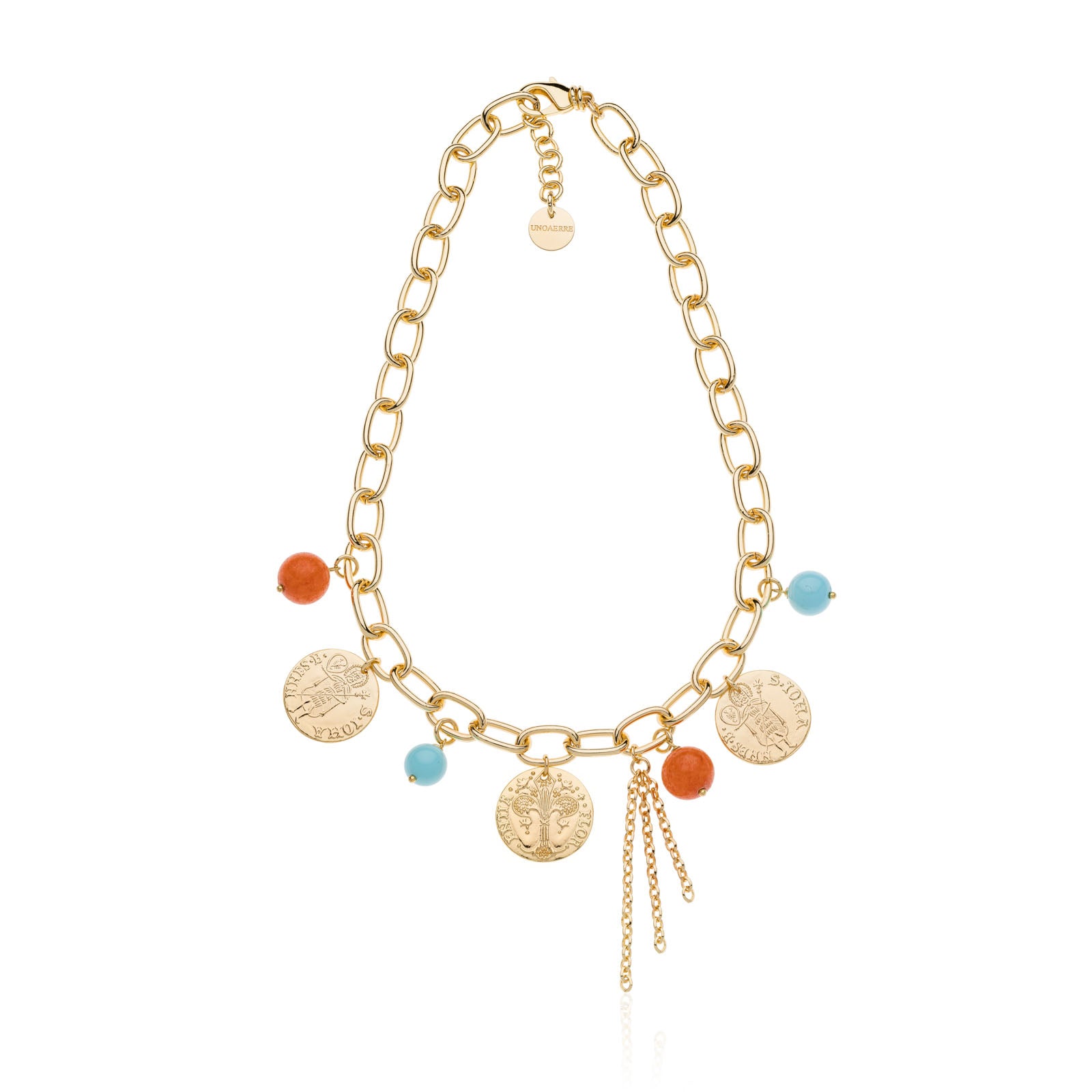 Collana catena forzatina ovale dorata con charms monete e perle colorate corallo e turchese. Un gioiello dall'irresistibile mood Bohémien per un mix d'eleganza e fascino gitano che conquisterà la tua estate. Completa il look con bracciale ed orecchini coordinati e fai tintinnare il tuo stile!