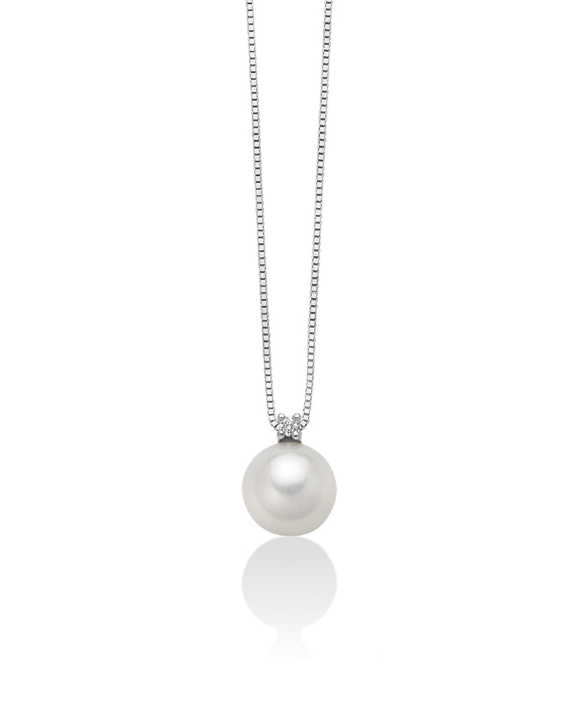 Collana con pendente della collezione Miluna Perle 375 da donna. Colore: oro bianco e bianco. Il gioiello è in oro bianco 375‰ (9Kt) composto da una catena veneziana con perla coltivata ø 7-7,5 e diamante taglio brillante rotondo di caratura totale di 0,01 - colore G - purezza SI con chiusura a moschettone in oro bianco 375‰ (9Kt). Lunghezza 42 cm. 100% Made in Italy.