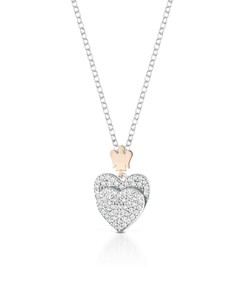 Collana con pendente della collezione Roberto Giannotti Microlighting da donna. Colore: argento e oro rosa. Il gioiello girocollo è in argento 925‰ rodiato e rosé con un ciondolo composto da un angioletto e da un doppio cuore impreziosito da un pavé di zirconi bianchi. Il ciondolo a forma di cuore misura : base 1,2 cm, altezza 1,2 cm. Lunghezza regolabile da 40 cm a 45 cm con chiusura a moschettone.