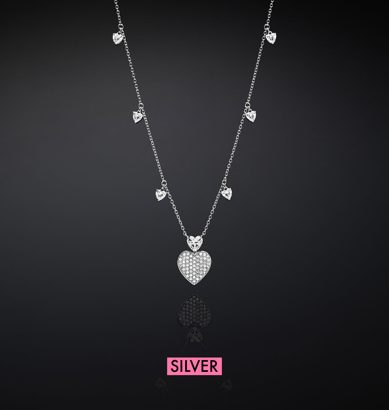 Collana realizzata in argento 925 con zirconi bianchi a forma di cuore e pendente centrale con pavé.