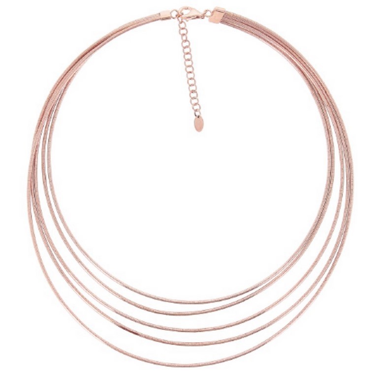 Collana girocollo 5 fili con chiusura a calamita.Elegante e particolare della collezione DNA composta da oro rosa,questa particolare composizione rende i fili morbidi,leggeri e leggermente elastici che seguono le linee del corpo.
