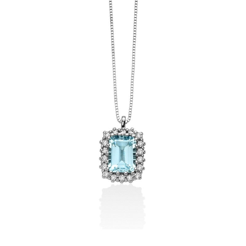 Collana in oro bianco 750 818KT) da Donna caratterizzata da un acquamarina naturale taglio ottagonale 0,90 ct pendente impreziosita da un contorno di luminosi diamanti taglio brillante 0,0162 ct