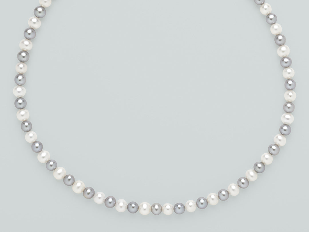 Collana da donna, prodotta da Miluna, referenza articolo 1MOT455, Realizzata da un filo di perle d’acqua dolce, colore alternato grigio e bianco, diametro 4,5-5. Chiusura realizzata in oro bianco 750%.