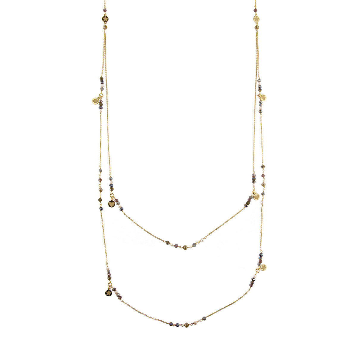 Collana con doppia catena argento e pietre miste nelle tonalità del marrone.
