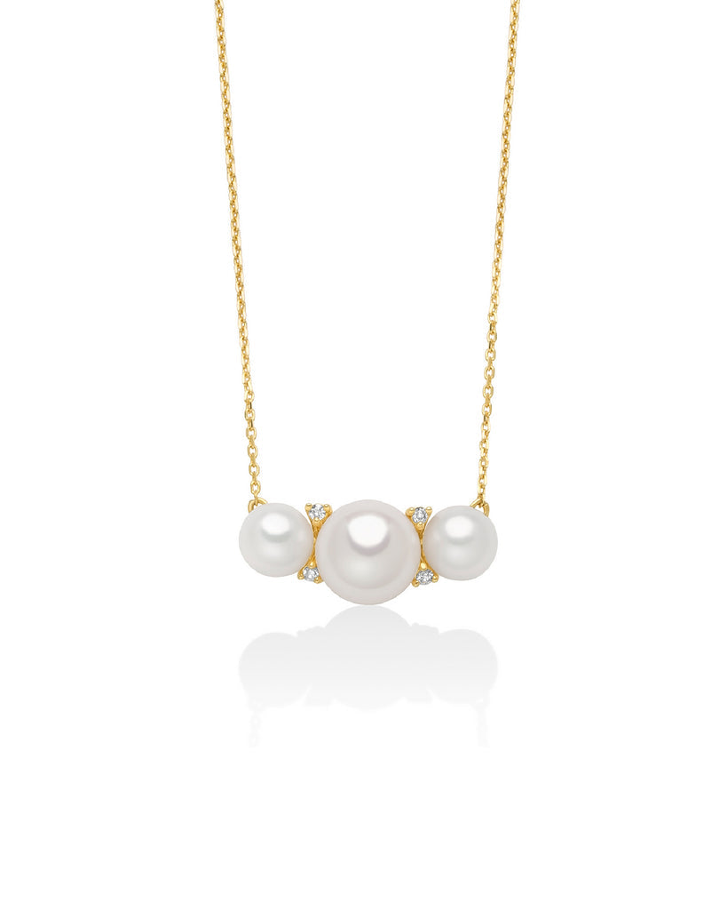 Collana con pendente della collezione Miluna Perle 375 da donna. Colore: oro e bianco. Il gioiello è in oro giallo 375‰ (9Kt) con ciondolo impreziosito da 4 diamanti naturali di caratura totale 0,0192 - colore G - purezza SI e da una perla vera bianca ø 6/6,5 di diametro e da due perle vere bianche ø 4,5/5 di diametro. Lunghezza 42 cm con chiusura a moschettone.
