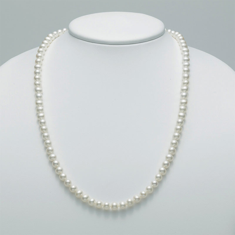 Collana con perle della collezione Miluna Perle Con Chiusura da donna. Colore: oro bianco e bianco. Il gioiello è composto da un filo di perle coltivate di colore bianco ø 5-5,5 con chiusura a moschettone in oro bianco 750‰ (18Kt). Misura: 40 cm più chiusura.