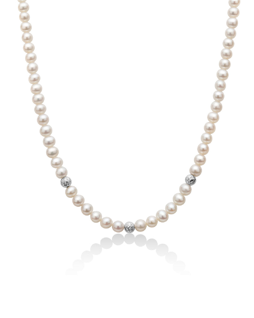 Collana con perle della collezione Miluna Perle Boule e Fantasia da donna. Colore: oro bianco e bianco. Il gioiello è composto da un filo di perle coltivate di colore bianco ø 4,5-5 e tre boule puntinate con chiusura a moschettone in oro bianco 750‰ (18Kt). Lunghezza: 42 cm. 100% Made in Italy.
