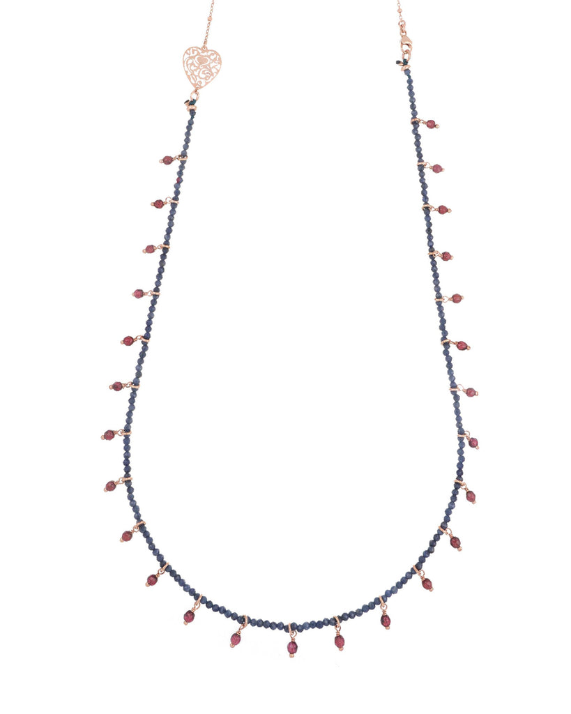 Collana lunga della collezione Maman et Sophie Zaffiro e Granato da donna. Colore: oro rosa, blu e rosso. Il gioiello è in argento 925‰ con galvanica oro rosa ad alto spessore e resistenza impreziosito da pietre di zaffiro e da gocce di granato pendenti. La collana è caratterizzata inoltre dal cuore Vittoriano traforato. Lunghezza totale 87,5 cm con chiusura a moschettone.
