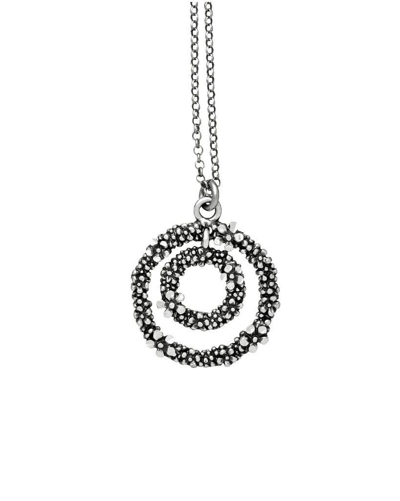 Collana girocollo della collezione Giovanni Raspini Millefiori da donna. Colore: argento. Il gioiello è in argento 925‰ rodiato con un pendente composto da due cerchi decorati con dei piccoli fiori realizzati a mano in fusione a cera persa. Lunghezza totale 45 cm con chiusura a moschettone.